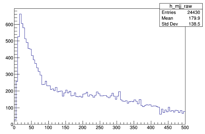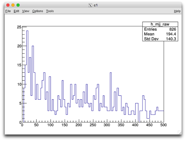 $ root -l myOutputFile.root root [1] .ls TFile** myOutputFile.root TFile* myOutputFile.root KEY: TH1D h_njets_raw;1 KEY: TH1D h_mjj_raw;1 root [2] h_mjj_raw->Draw();