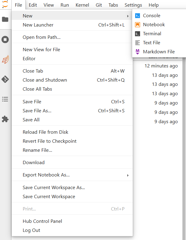 The New dropdown menu allows you to open the console or a file of a specified format directly. The New Launcher option creates a new tab with buttons that permit you to launch a console or a new file, exactly like the interface you are shown when you first open coffea-casa.