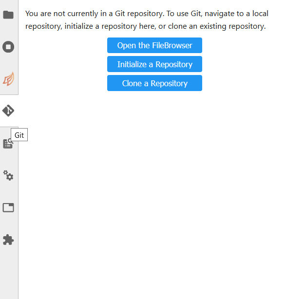 Simply click the appropriate button (initialize a repository, or clone a repository) and you'll be hooked up to GitHub. This should then take you to the File Browser tab, which is where you can see all of the repositories you have cloned in your JupyterLab instance. The File Browser should look like this:
