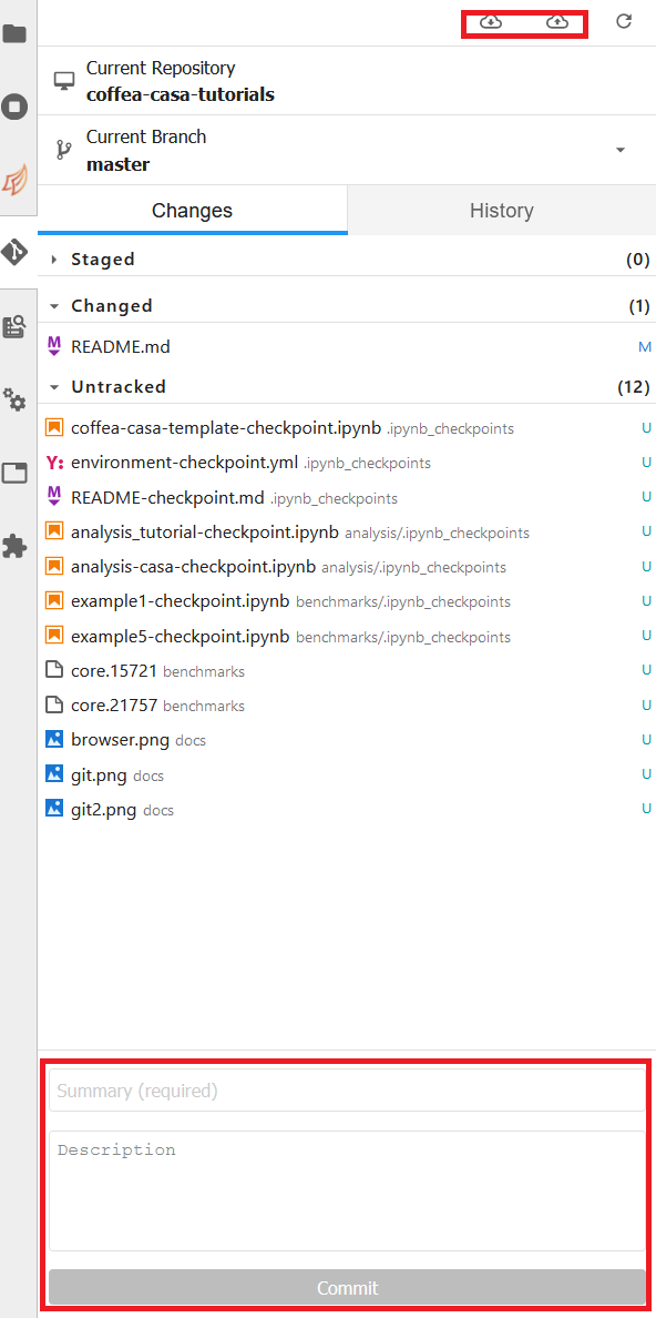 The buttons in the top right allow for pulling and pushing respectively. When you have edited files in a directory, they will show up under the Changed category, at which point you can hit the + to add them to a commit (at which point they will show up under Staged). Filling out the box at the bottom of the sidebar will file your commit, and prepare it for you to push.