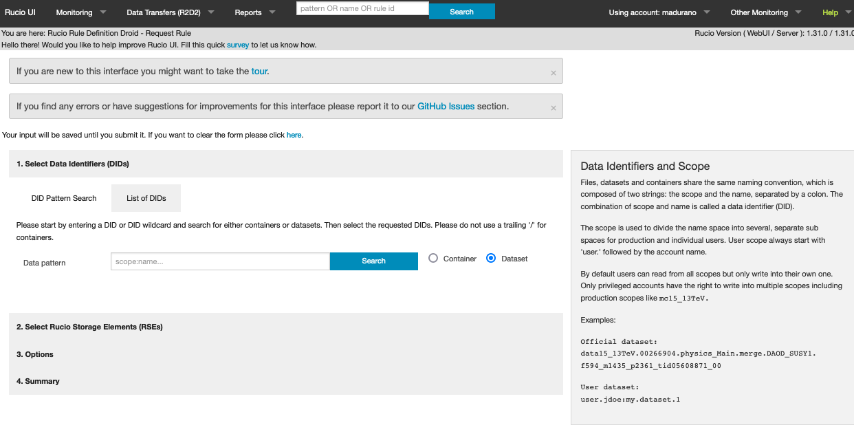 - Using r2d2, make your request in the Rucio page rucio r2d2 request: